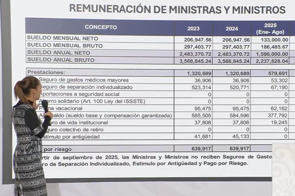 Durante la Mañanera del Pueblo, la presidenta Claudia Sheinbaum Pardo exhibió los sueldos, bonos y privilegios de los exministros de la Suprema Corte, al señalar que formaban parte de un esquema de excesos y beneficios ajenos a la función pública dentro del viejo Poder Judicial.