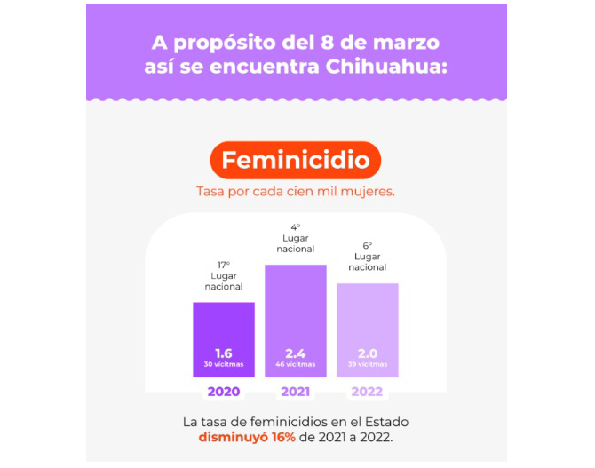 Aunque la tasa de feminicidios en el estado de Chihuahua disminuyó un 16 por ciento en el 2022 en comparación con el 2021, se mantiene en un ranking de primeros lugares a nivel nacional. En 2022 ocupó el lugar sexto.