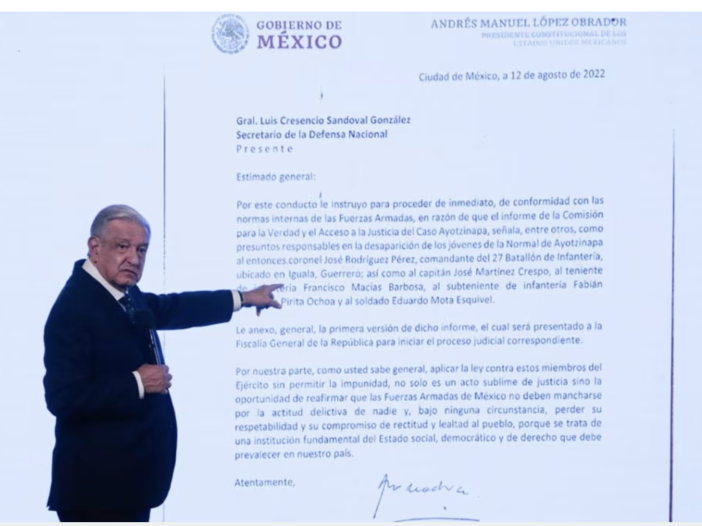 Señaló que la primera misiva de agosto de 2022 derivó en la detención de altos mandos del Ejército que estaban destacados en Guerrero y del exprocurador general de la República Jesús Murillo Karam.