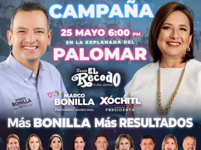 El sábado 25 de mayo, se espera el cierre de campaña nacional de la aspirante a la presidencia Xóchitl Gálvez de la coalición Fuerza y Corazón por México, con la banda El Recodo, en el parque El Palomar a las 18:00 horas.