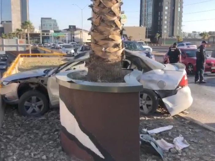 El accidente ocurrió luego de que el conductor perdiera el control de la unidad y chocara de lado contra la base metálica que contiene una palmera, quedando atrapado con lesiones de consideración.