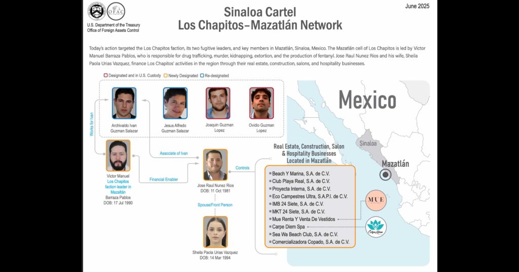 La OFAC también sancionó a una red regional de asociados y negocios de Los Chapitos establecidos en Mazatlán que se dedica al tráfico de drogas, extorsión, secuestro y lavado de dinero.