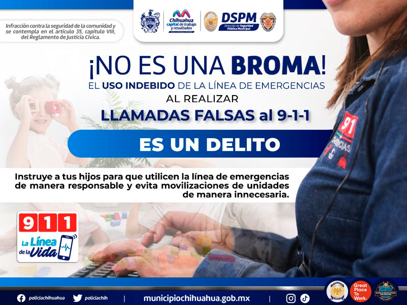 Debido a la gran cantidad de llamadas falsas que ingresan diariamente a la línea de emergencias 9-1-1, el Gobierno Municipal pide a los chihuahuenses ser responsables y utilizar este número sólo en casos de una emergencia real y no realizar bromas o solicitar información de otro tipo.