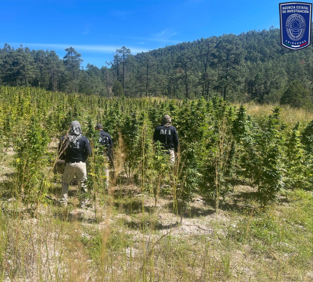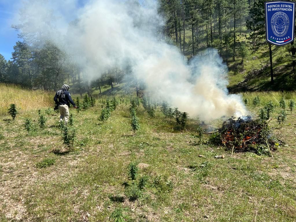 Destruyen elementos de la Agencia Estatal de Investigación 38 mil 500 plantas de mariguana de tres plantíos localizados cerca de la comunidad La Onza, municipio de Guadalupe y Calvo.