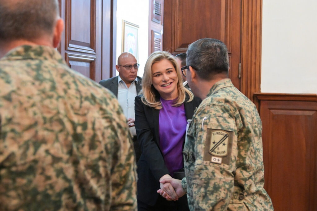 En esa visita estuvo acompañada por el secretario de la Defensa Nacional, Ricardo Trevilla Trejo, de acuerdo con la información difundida por la propia mandataria. En ningún momento se menciona la presencia de la gobernadora del estado.