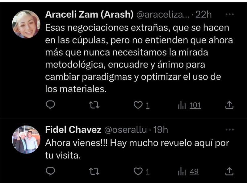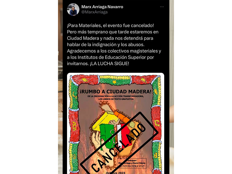 “¡Para Materiales, el evento fue cancelado! Pero más temprano que tarde estaremos en Ciudad Madera y nada nos detendrá para hablar de la indignación y los abusos. Agradecemos a los colectivos magisteriales y a los Institutos de Educación Superior por invitarnos. ¡La lucha sigue!”, expresó en su mensaje publicado el 20 de octubre.