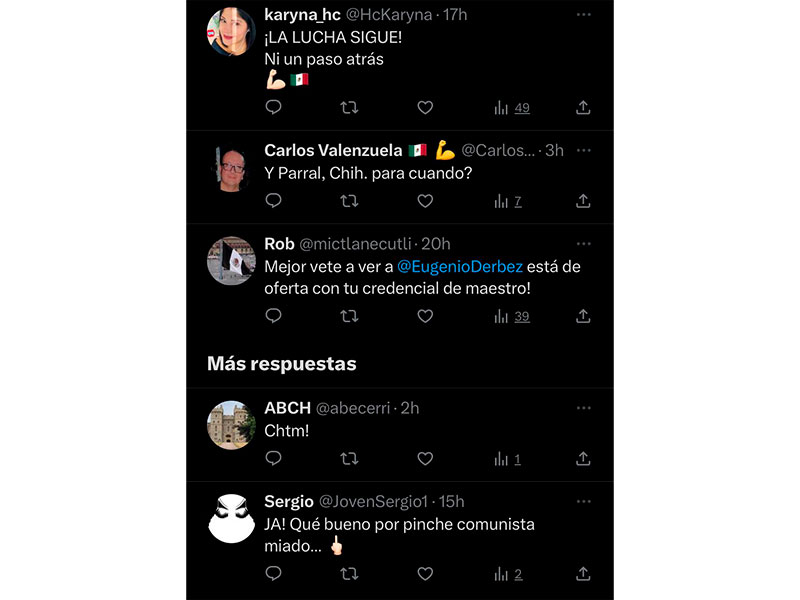 En su misma red social, se pueden ver comentario a favor y en contra, algunos con palabras altisonantes y otros como “mofa” comparándole con Eugenio Derbez. Mientras que otros usuarios le reiteran que “la lucha sigue” y le piden presentarse también en Parral.