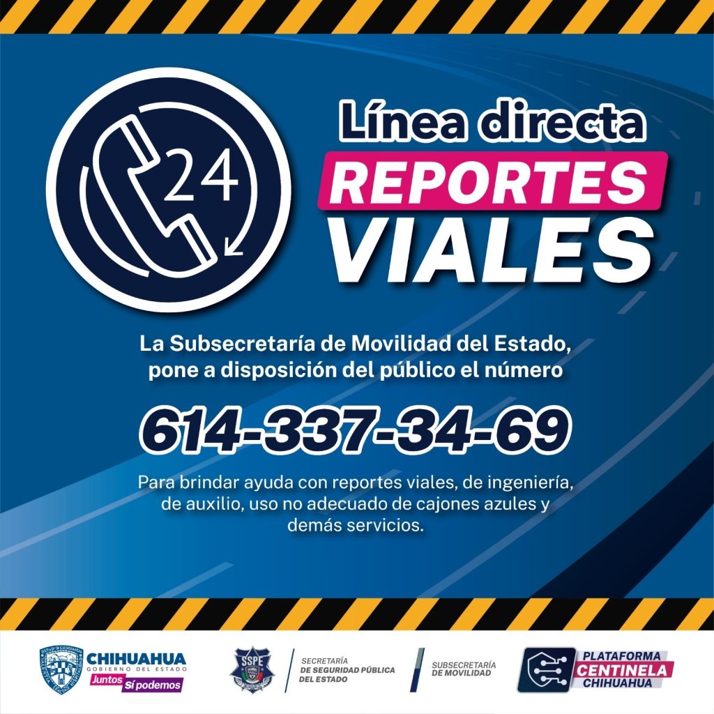 La Línea Directa de Reportes Viales podrá ser utilizada a través del teléfono 614-337-3469 para recepción de reportes viales por medio de llamada, mensaje instantáneo o WhatsApp.