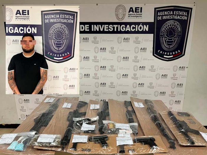 Elementos de la Agencia Estatal de Investigación detuvieron en términos de flagrancia en Ciudad Juárez, a un sujeto en posesión ocho armas de fuego (seis armas largas y dos pistolas), cartuchos, equipo de radio comunicación, así como mariguana y fentanilo.