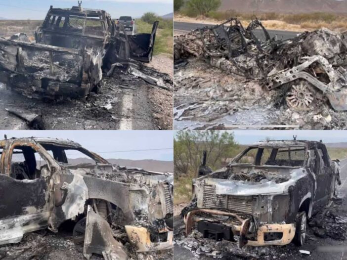 También se menciona una camioneta Silverado y Otra Ford King Ranch, así como un tráiler que quedó igualmente calcinado y atravesado en la carretera.