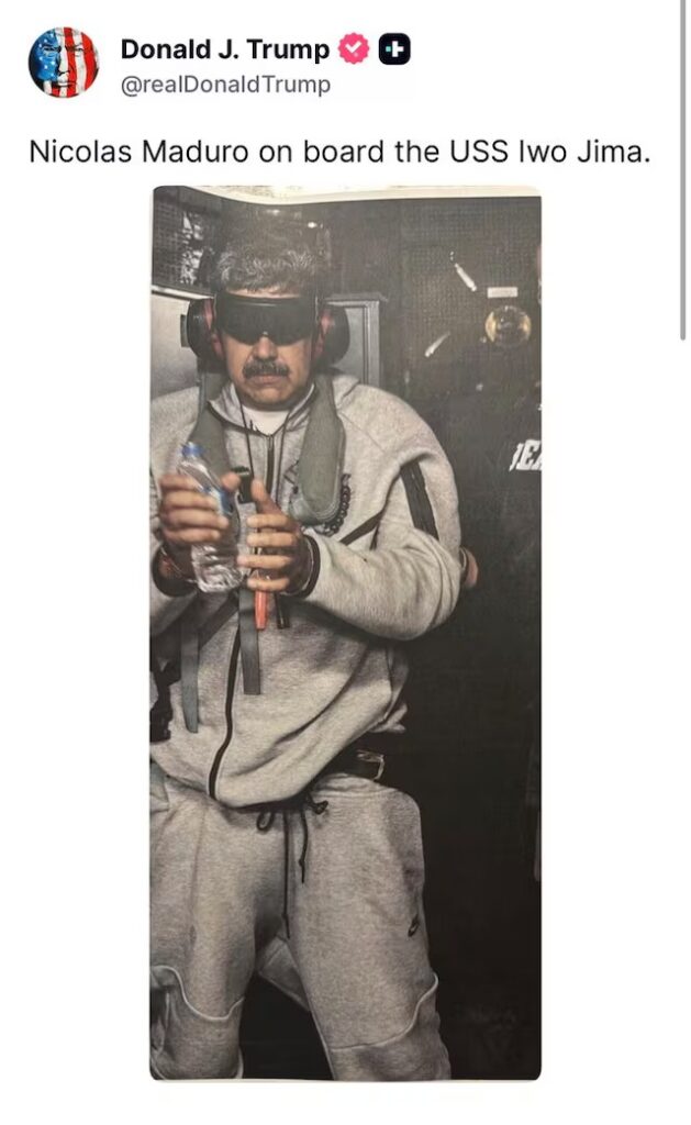 La fotografía fue compartida por Trump en sus redes sociales como parte de la narrativa oficial sobre la operación, en la que Washington asegura haber detenido al mandatario venezolano y trasladarlo fuera del país para enfrentar cargos en tribunales estadounidenses.