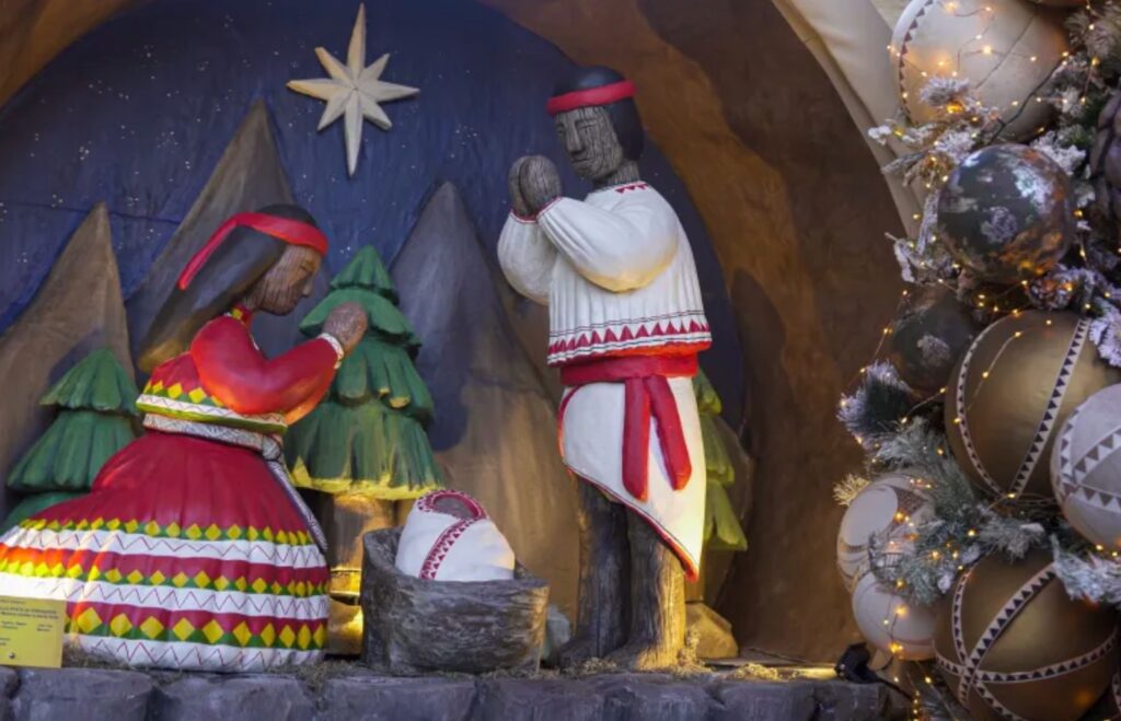 Las figuras —una María y un José rarámuris, vestidos con atuendos tradicionales y arrodillados bajo una estrella tallada— representan a la primera familia desde la mirada de los pueblos originarios. El pesebre, montado dentro de una estructura que evoca un gran tambor, se acompaña de un árbol navideño decorado con elementos de barro, pino seco y motivos serranos, lo que convirtió al conjunto en uno de los más fotografiados de la jornada.