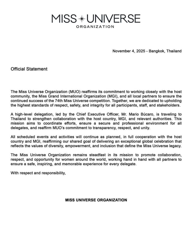 Por su parte, la Miss Universe Organization (MUO) emitió un pronunciamiento más diplomático, sin mencionar a Nawat por nombre, donde aseguró que mantendrán los “más altos estándares de respeto, seguridad e integridad para todas las participantes”.