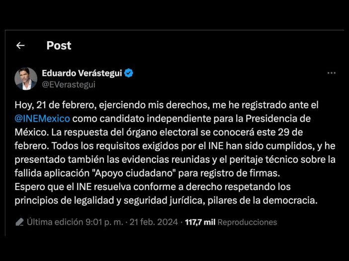 En su publicación, expresó que espera que “el INE resuelva conforme a derecho, respetando los principios de legalidad y seguridad jurídica, pilares de la democracia”.