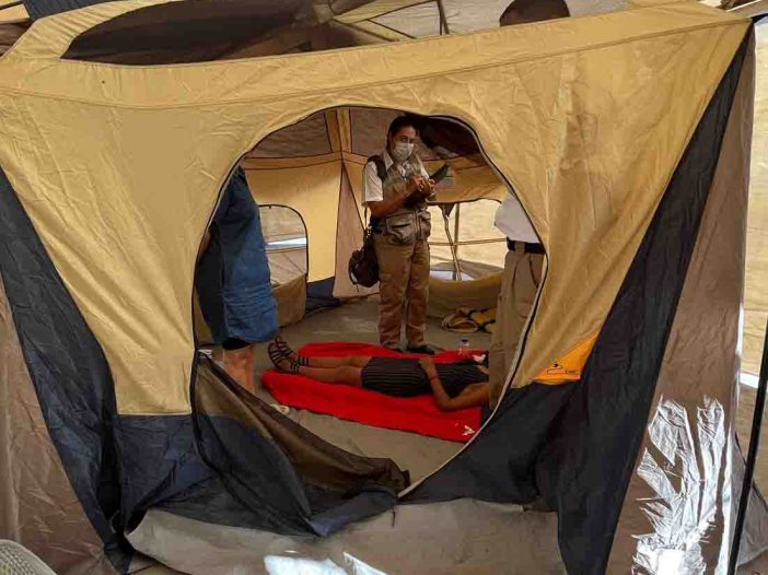 Sandra Trevizo, despedida de la Delegación Regional de Bienestar y quien se encuentra en huelga de hambre desde ayer, fue atendida por paramédicos de la Unidad de Rescate de Gobierno del Estado (URGE) por presentar niveles bajos de azúcar y de presión.