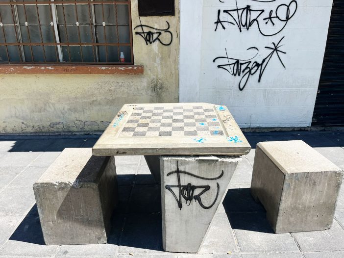 En mal estado, con grafitis y quebradas, lucen las mesas de ajedrez instaladas como parte del mobiliario urbano de la calle Morelos, en pleno Centro Histórico.