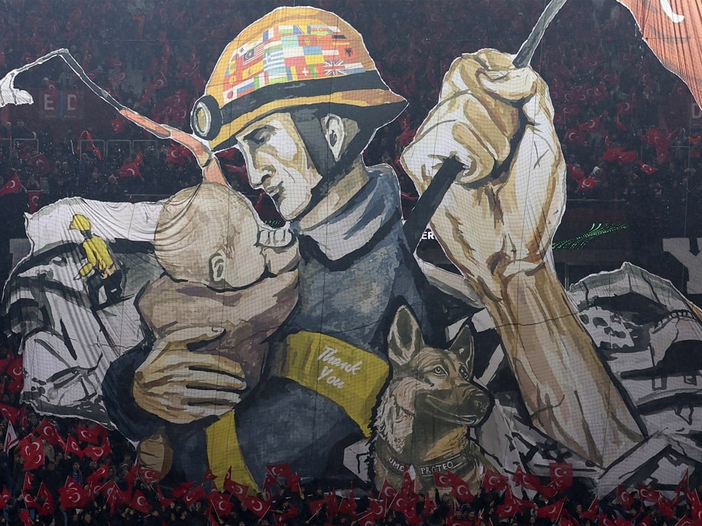 Los fanáticos del cuadro turco hicieron un emotivo mosaico en las tribunas del Medical Park Stadyumu en honor a los rescatistas que han apoyado para salvar vidas, y en la enorme imagan aparece el can mexicano, con un collar en el que se puede leer UME (Unidad Militar de Emergencias) – Proteo.