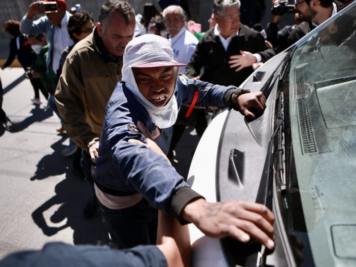 La camioneta en la que se transportaba al presidente, Andrés Manuel López Obrador, tuvo que forzar su salida del estacionamiento del Gimnasio del Colegio de Bachilleres ante el bloqueo humano de migrantes, activistas y medios de comunicación.
