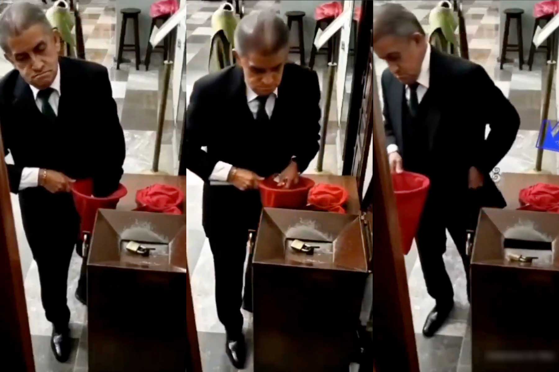 En las imágenes, difundidas este 11 de marzo de 2026, se observa cómo el sujeto introduce la mano en un cepo (la bolsa o saco donde se depositan las ofrendas de los fieles), extrae billetes y monedas, y los guarda en su saco.