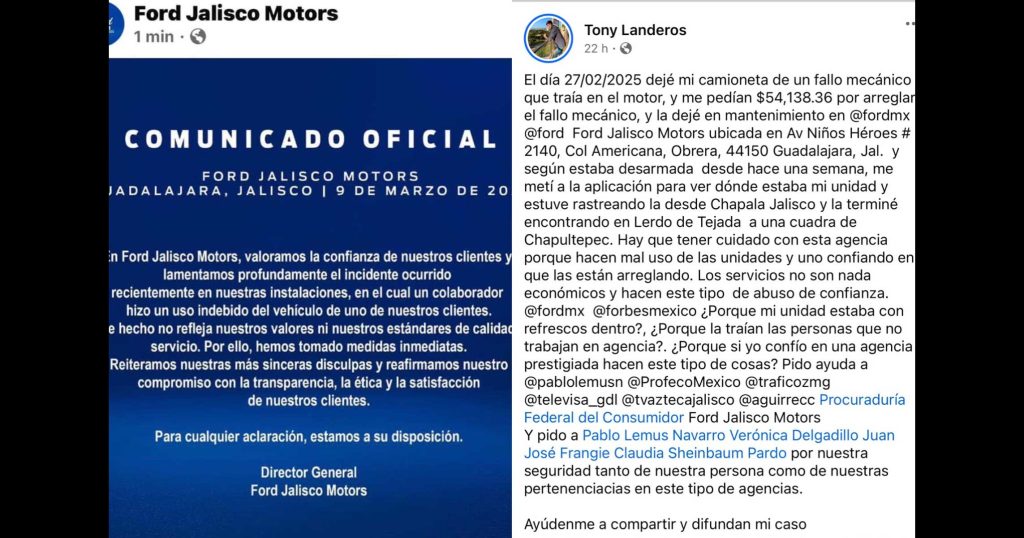 “Hay que tener cuidado con esta agencia porque hacen mal uso de las unidades y uno confiando en que las están arreglando. Los servicios no son nada económicos y hacen este tipo de abuso de confianza. @fordmx @forbesmexico ¿Porque mi unidad estaba con refrescos dentro?, ¿Porque la traían las personas que no trabajan en agencia?, ¿Porque si yo confío en una agencia prestigiada hacen este tipo de cosas?”, cuestionó el denunciante.