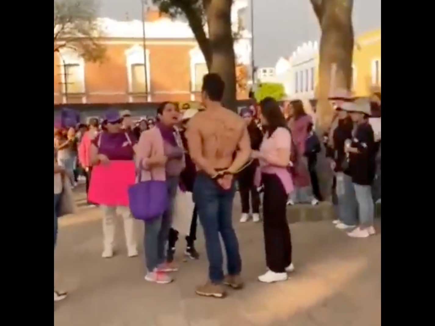 El sujeto, identificado en algunas publicaciones en redes como Tadeo V. S., marchaba con el torso desnudo y manos atadas en un performance simbólico de apoyo a la causa feminista.