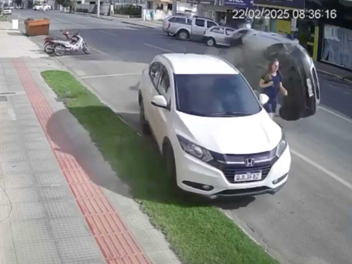 El peculiar percance vehicular, tuvo lugar en Santa Catarina, Brasil, en donde gracias a las videocámaras de vigilancia, se puede observar cómo una camioneta pequeña en color gris se impacta con un automóvil blanco.