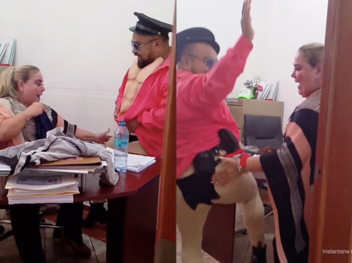 Las imágenes, difundidas ampliamente en redes sociales desde el fin de semana pasado (alrededor del 20 de febrero), captan a la funcionaria sentada en su escritorio mientras un hombre —conocido en el material como “Sexy Boy” o “Rasiel Ochoa II”— ingresa disfrazado (con mallas, pectorales de goma, gorro tipo quepí de policía y elementos de botarga).