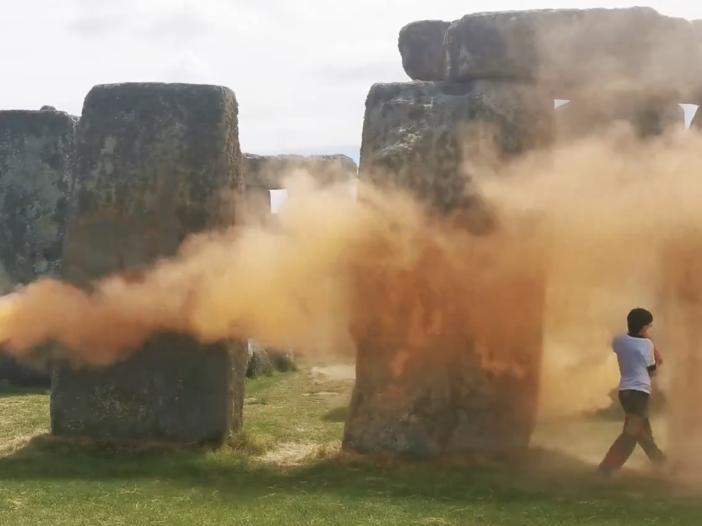 Se ve cómo ambos corren hacia Stonehenge y comienzan a lanzar la pintura, mientras dos personas llegan al lugar gritando que por favor lo dejen.