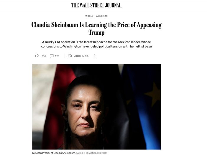 El Wall Street Journal publicó este martes un extenso reportaje en el que afirma que la presidenta Claudia Sheinbaum está pagando un alto costo político por su estrategia de concesiones hacia el presidente Donald Trump, y que una operación encubierta de la CIA en Chihuahua se ha convertido en la más reciente prueba de fuego para su enfoque.
