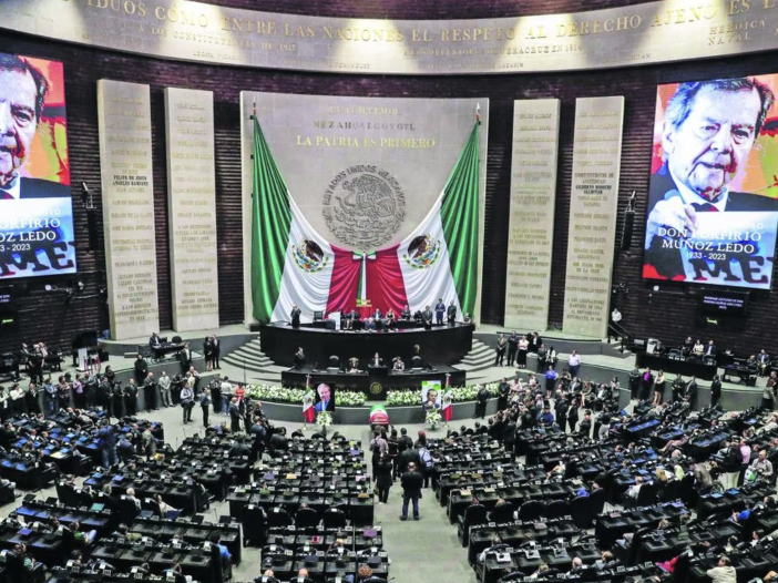 Al centro del Palacio Legislativo fue colocado el ataúd de Muñoz Ledo arropado por la Bandera Nacional, así como por dos fotos que recordaban los debates memorables que protagonizó como legislador durante 32 años.